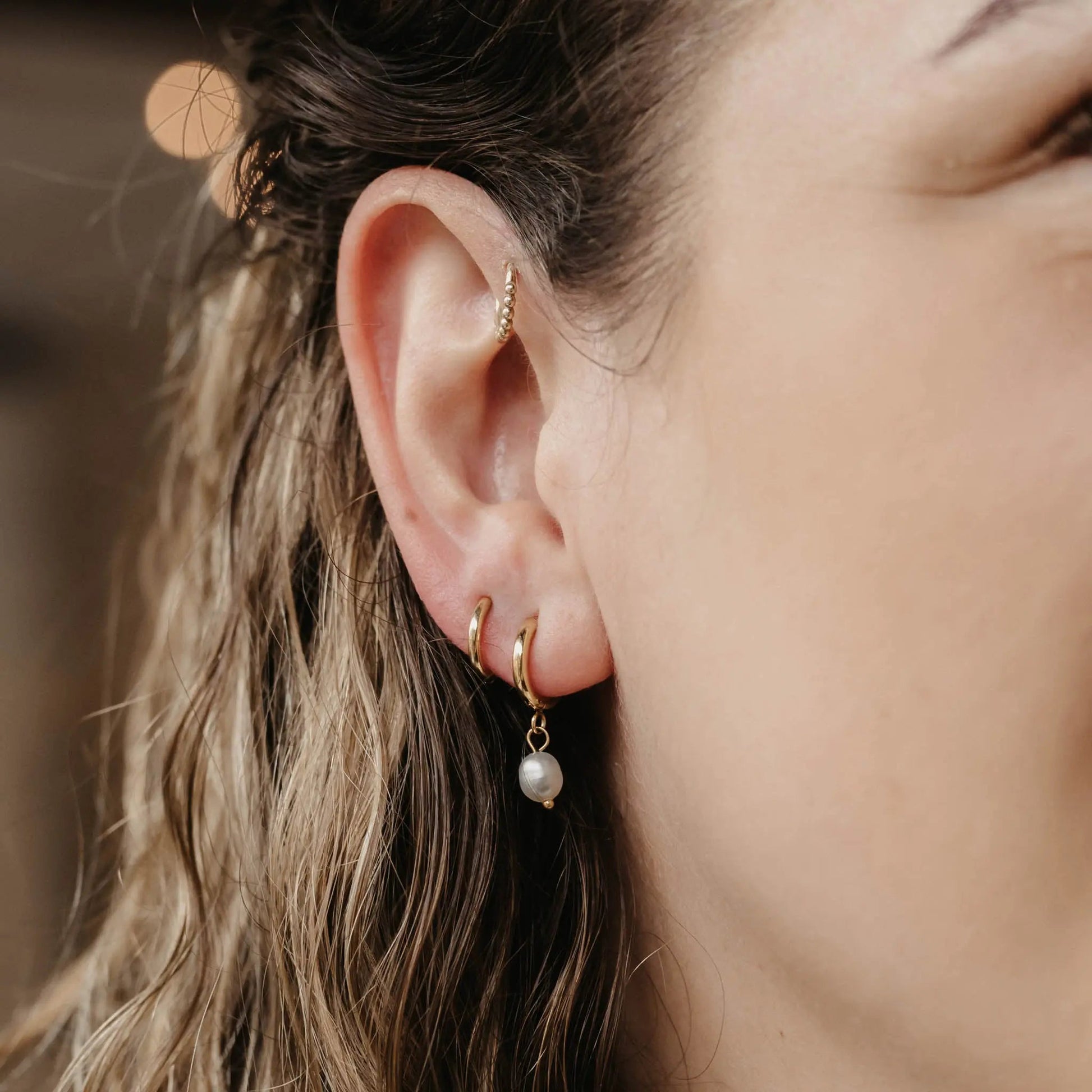This earring set includes two of our best-selling designs now crafted in stainless steel for even longer-lasting adventures, our Freshwater Pearl Hoop Earrings and Tiny Huggie Hoop Earrings. These two work great stacked in the ear or worn alone for a more minimal, elegant look.