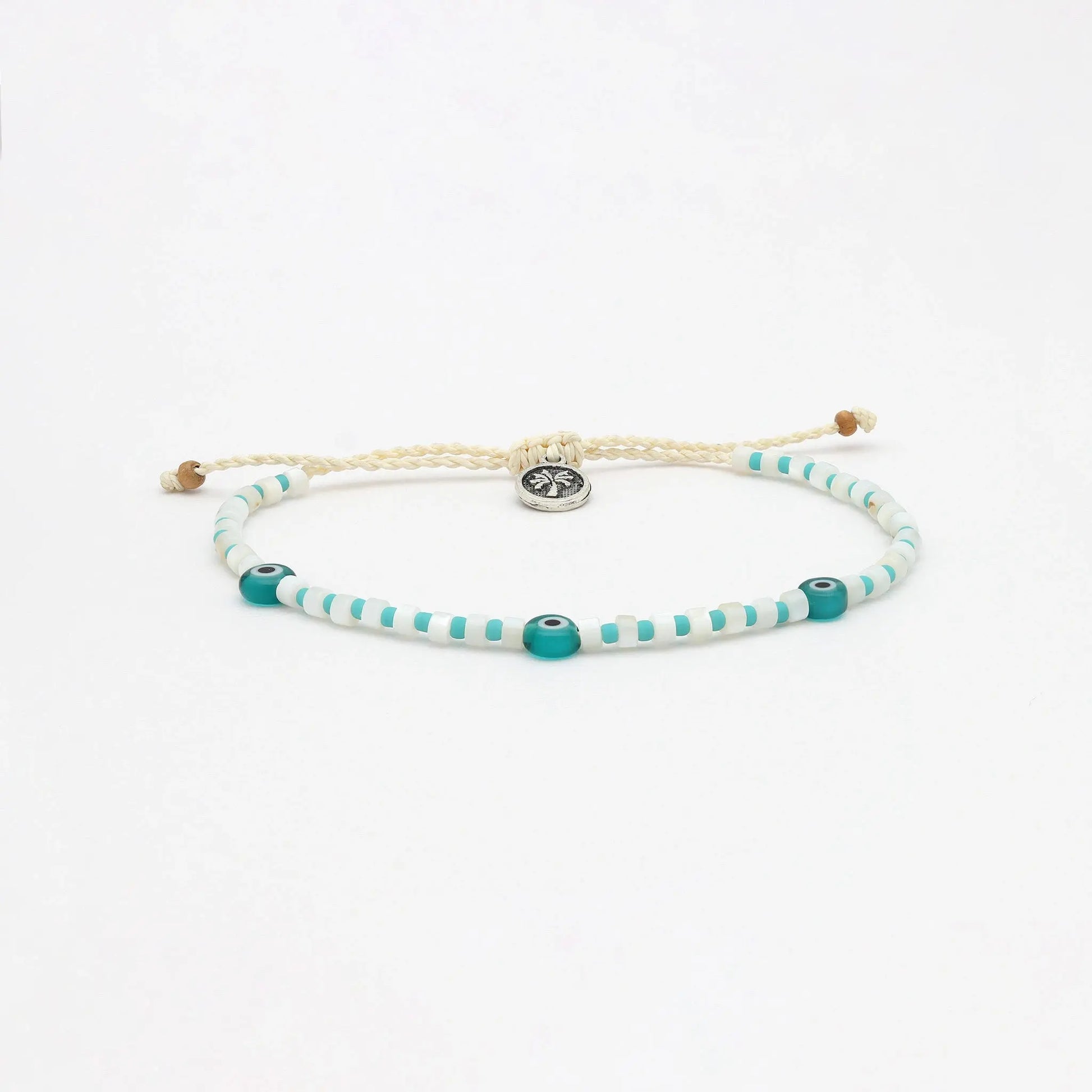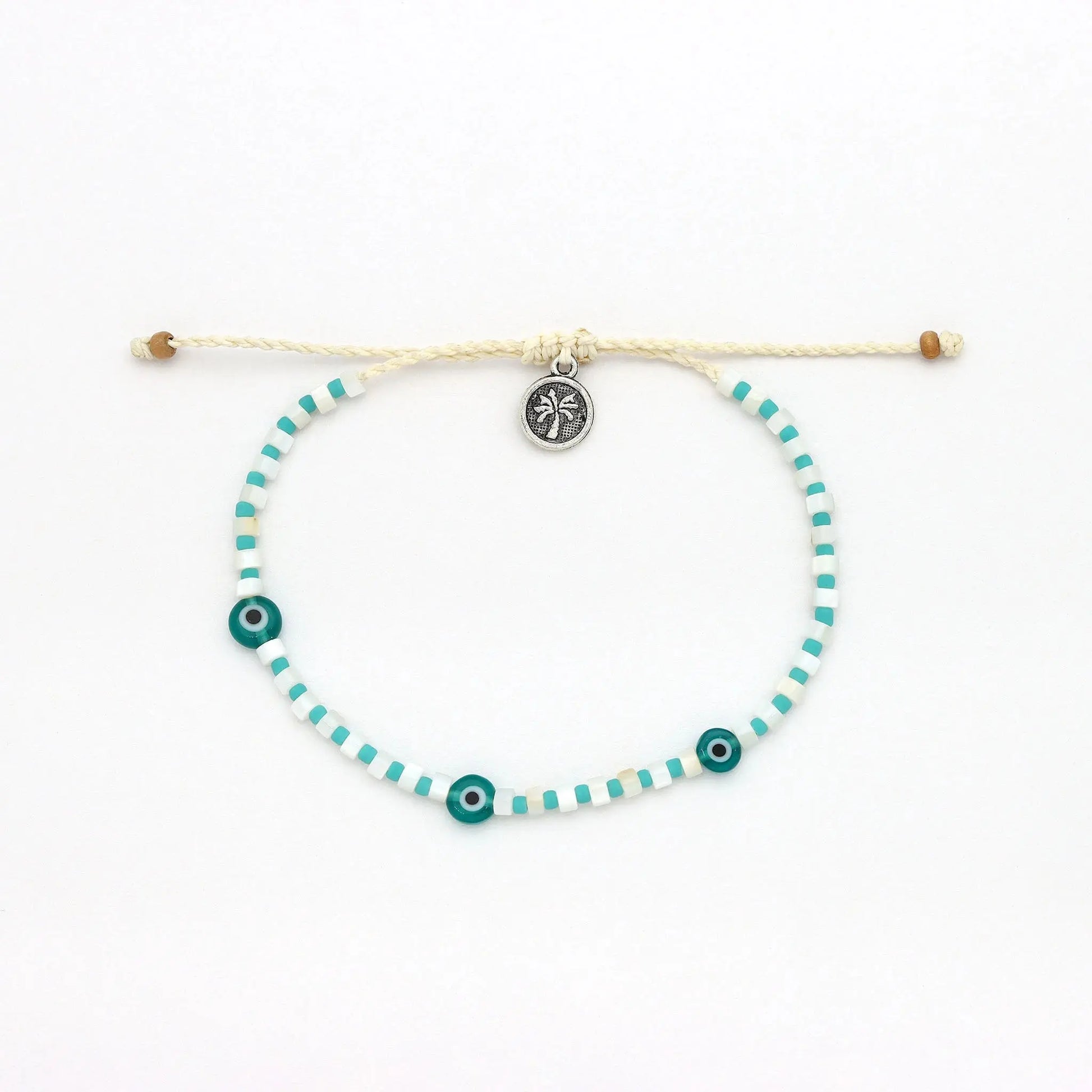 - Made with teal blue glass seed beads, glass evil eye charms, and a wax polyester cord.