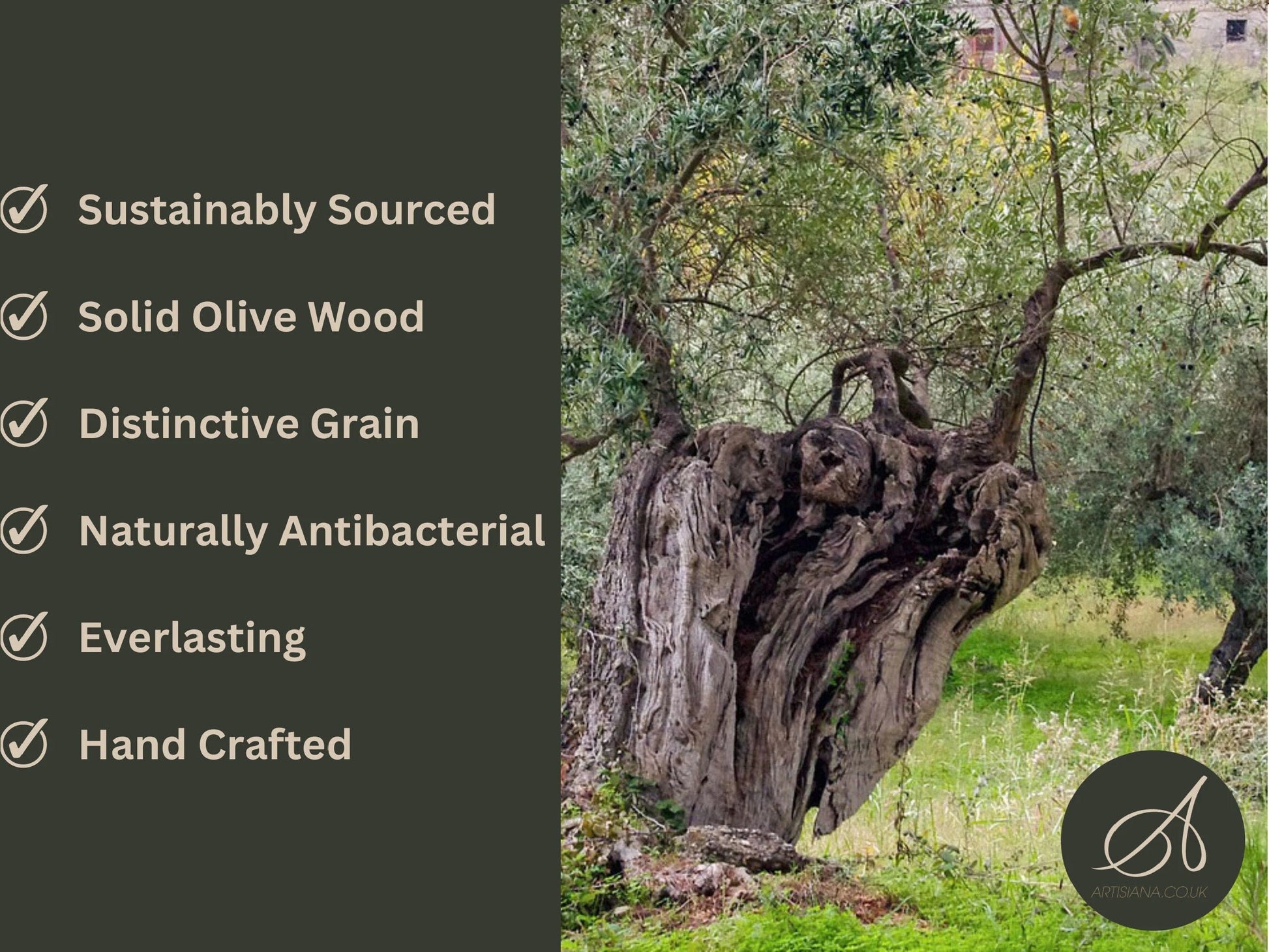 The olive wood is famous for being hard and resistant with beautiful grain, each item is unique and no two pieces of olive wood are alike.