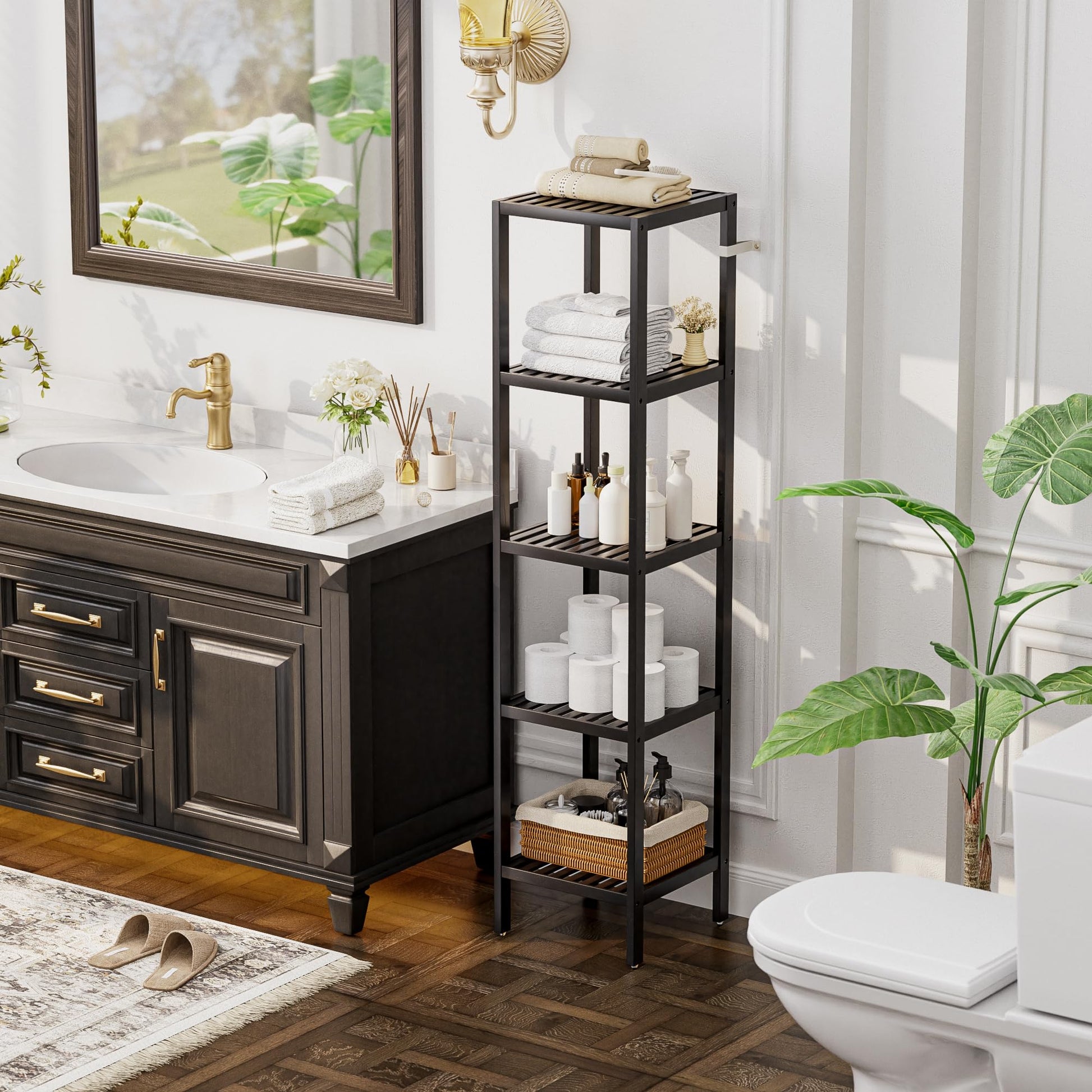 SMIBUY Bathroom Storage Shelf, 5-Tier Bamboo Rack Organizer, Multifunctional Shelving Unit for Living Room Bedroom Kitchen (Black)
